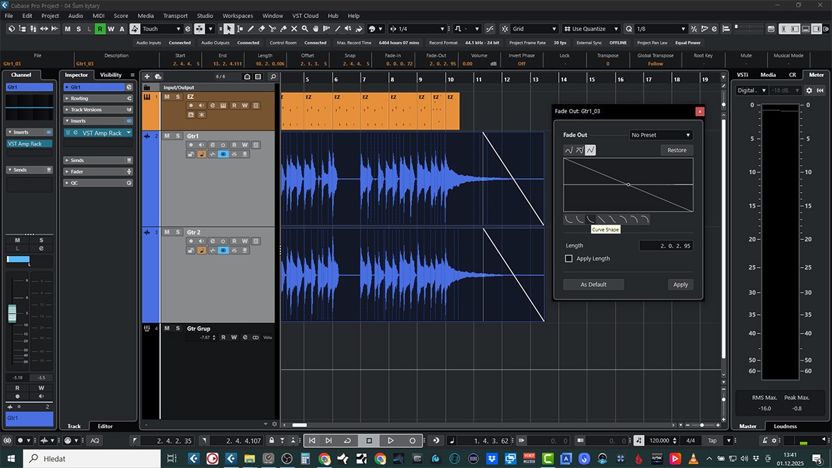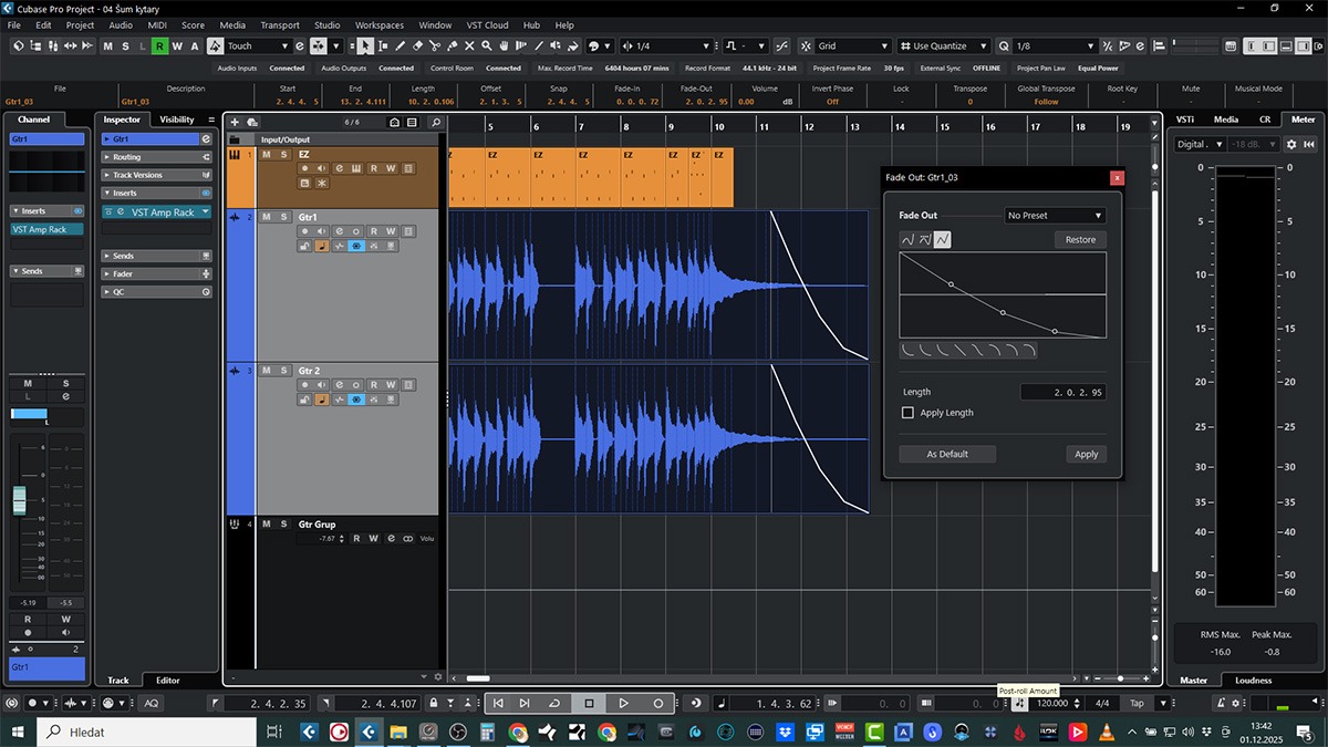 U kytar je specifické, že často chceme zachovat doznívání akordu. Fade‑out tedy nesmí být příliš agresivní – hledáme rovnováhu mezi zachováním přirozeného sustainu a potlačením brumu, který se ke konci více projevuje.