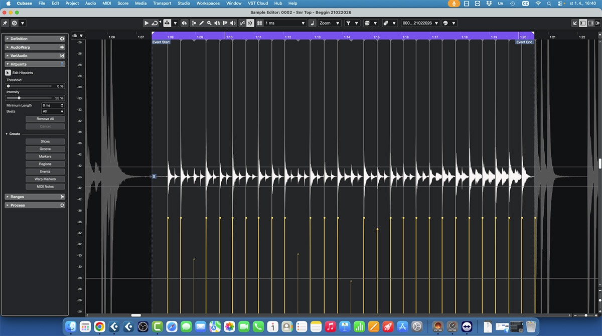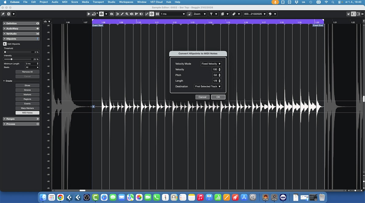 Editor hitpointů v Cubase, kde jsou v audio stopě vyznačené rozpoznané údery. Tato funkce slouží jako základ pro převod audio informací na MIDI noty.