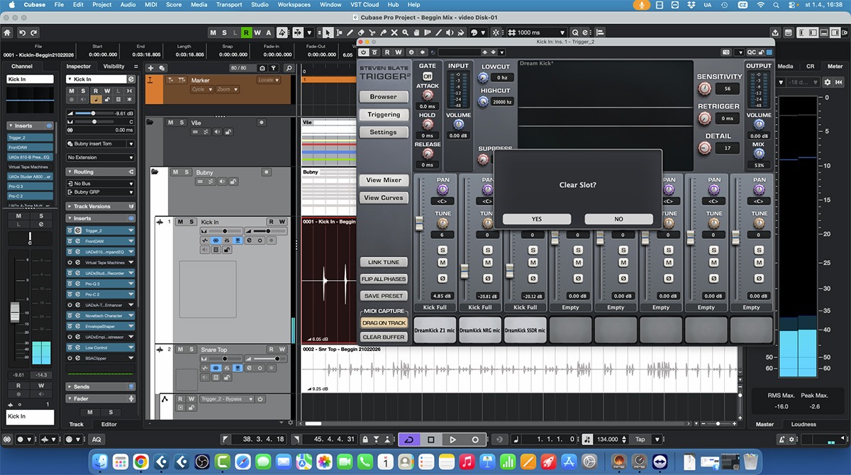 Plugin Steven Slate Trigger 2 s více vrstvami kopákových samplů a dialogem pro vymazání jednoho slotu. Na podobném nastavení je dobře vidět, že výsledný zvuk se často skládá z několika vrstev s různou funkcí.