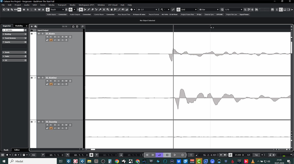 Na obrázku vidíme typickou ukázku dvou stop mimo fázi. Stopy dvou mikrofonů z kopáku = problém, který je třeba vyřešit.