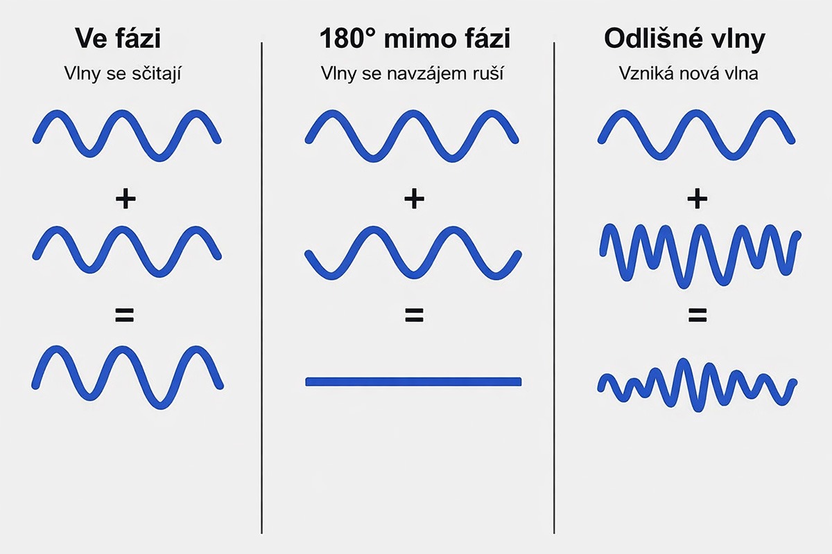 - Vlny v protifázi (180°) – maxima jedné vlny se potkávají s minimy druhé a signál se výrazně odečítá.