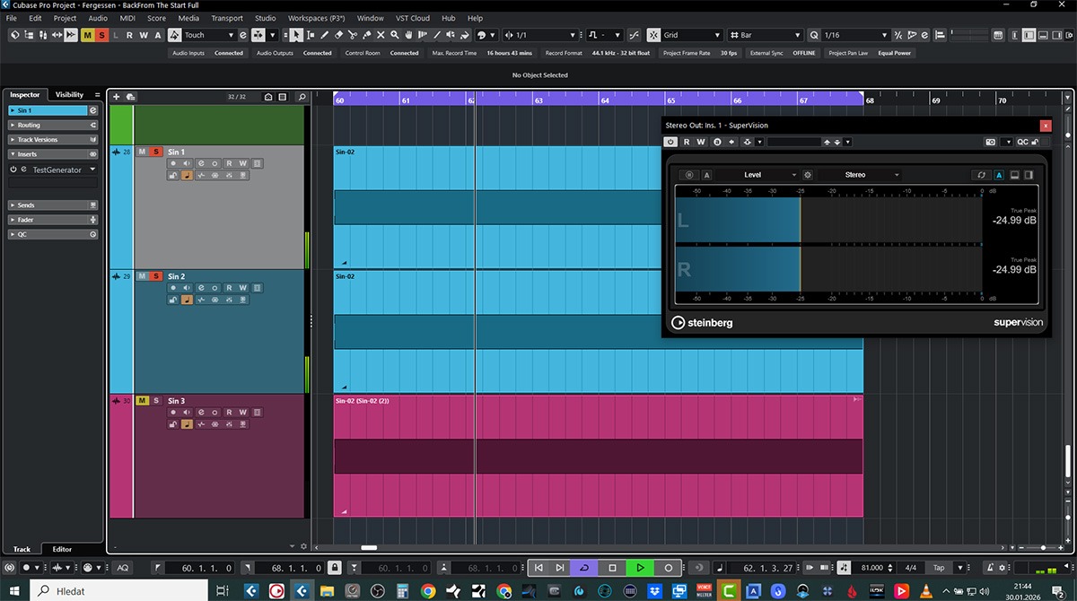 Přehrávání dvou vln ve fázi = nárůst energie – na měřáku vidíme hodnotu –24,99 dB.
