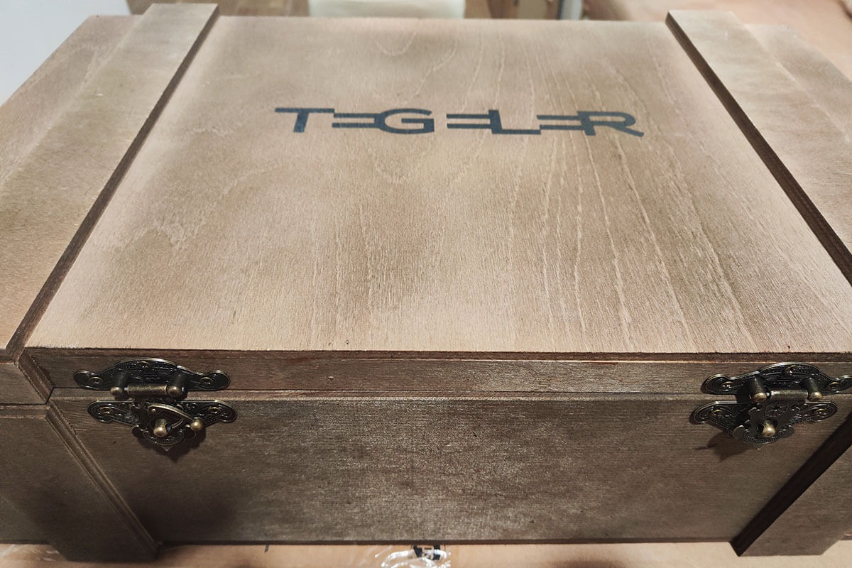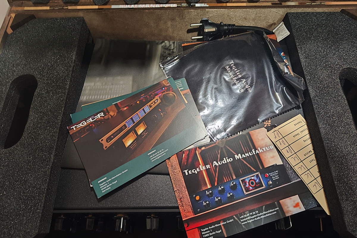 Ekvalizér dorazil v pěkné dřevěné „bedně“ vypolstrované hutným molitanem a po vybalení bylo hned jasné, že je postaven velmi bytelně. Přibalen byl síťový kabel, produktový katalog Tegeler, a navíc čtyři plastové podložky pod šrouby na uchycení do racku. Jeho výška je 2U.