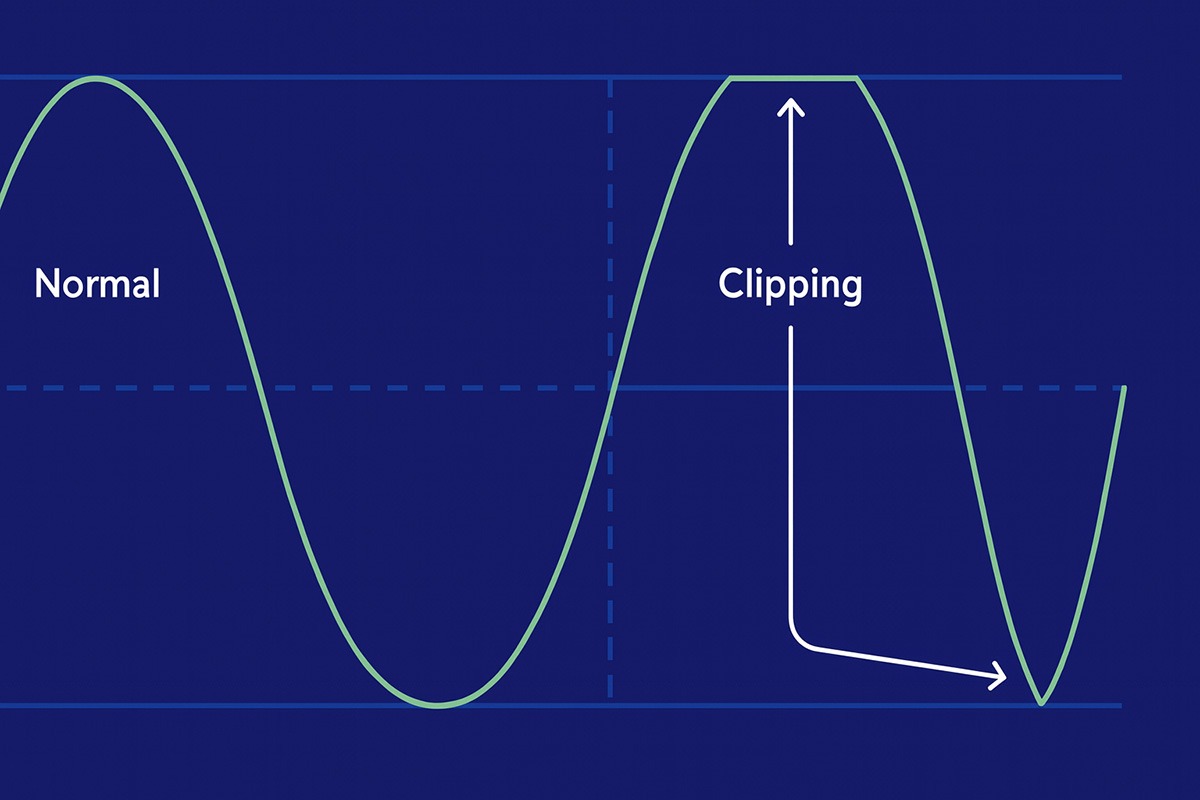 Na obrázku vidíme, jak vypadá čistý signál a jak je amplituda signálu „oříznutá“, pokud je hlasitost v digitálním prostředí příliš vysoká. Tento jev nazýváme clipping. Jedná se o degradaci zvuku, jež se projeví chrastěním či slyšitelným zkreslením, které je téměř nemožné z nahrané stopy odstranit.